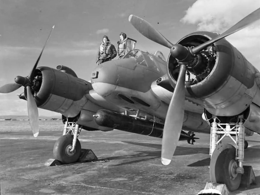 Bristol Beaufighter Mk. X (Serial No. NE425), coded 2–G, No. 404 Squadron, RCAF, coded 2-G, later coded EE, carrying a torpedo fitted with a wooden tail stabilizer.