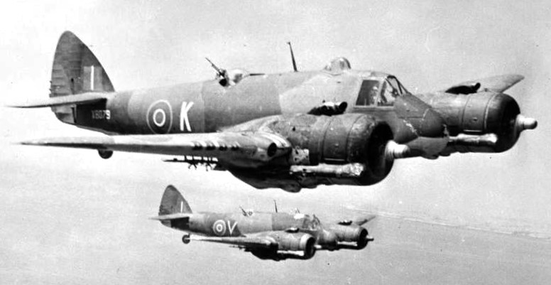 Bristol Beaufighters Mk. VIC (Serial No. X8079), coded ‘K’, behind Mk. IC (Serial No. T5043), coded ‘V’, of No. 272 Squadron RAF in flight over Malta, 1943.