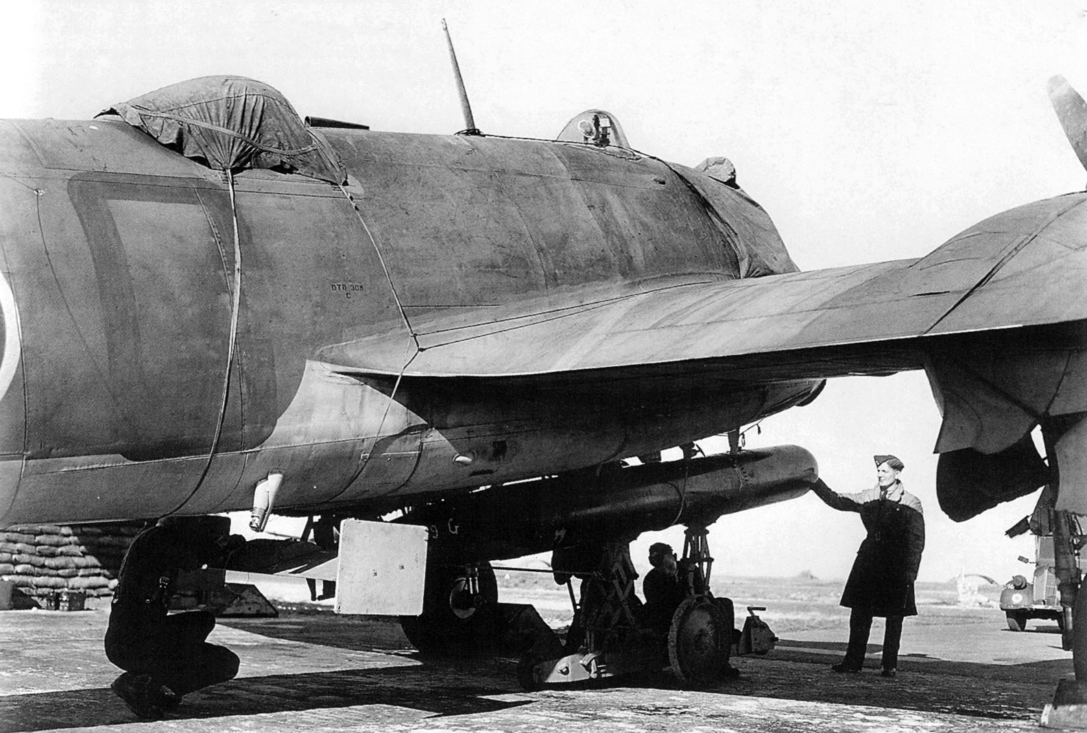 Bristol Beaufighter Mk. X (Serial No. NE425), coded 2–G, No. 404 Squadron, RCAF, coded 2-G, later coded EE, being rearmed with a torpedo.