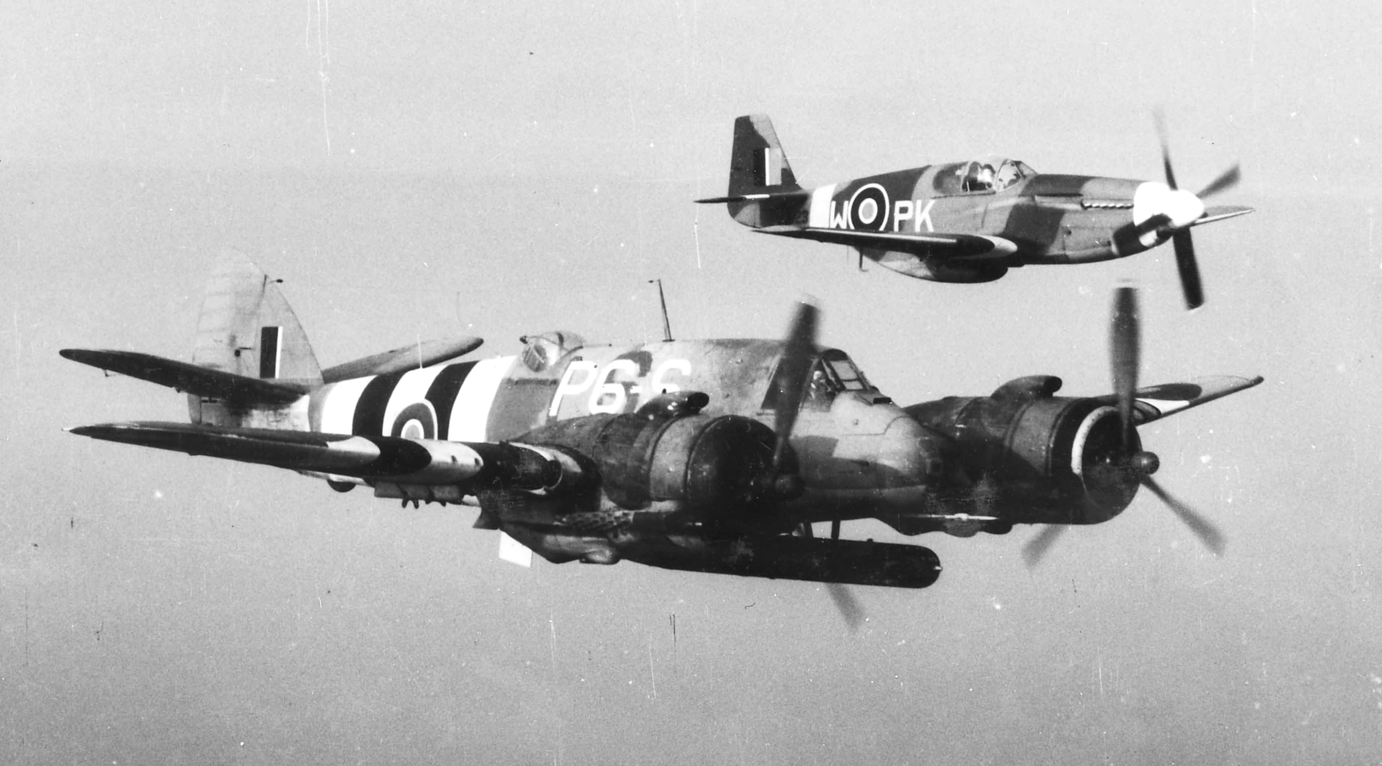 Bristol Beaufighter, coded P6-S, escorted by a Polish North American P-51 Mustang, coded PK-W, No. 315 Squadron