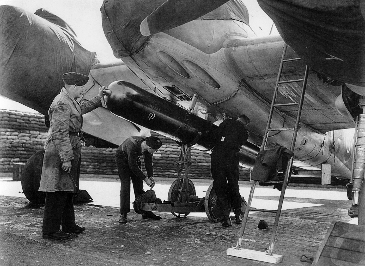 Bristol Beaufighter Mk. X (Serial No. NE425), No. 404 Squadron, RCAF, coded 2-G, later coded EE, being rearmed with a torpedo.