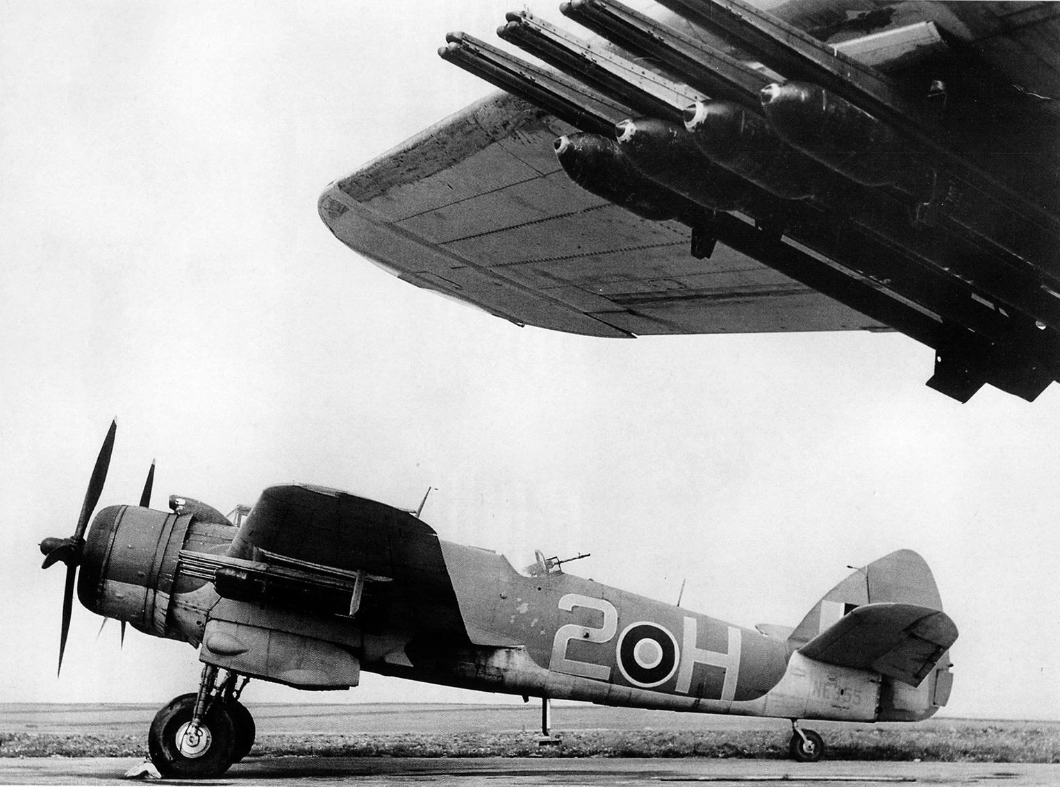 Bristol 156 Beaufighter TF Mk. X (Serial No. NE255), coded EE-H, No. 404 Squadron, RCAF, Banff, Scotland, 21 Aug 1944. The aircraft is carrying rocket projectiles (RP) with 25 lb. warheads for anti-shipping operations.