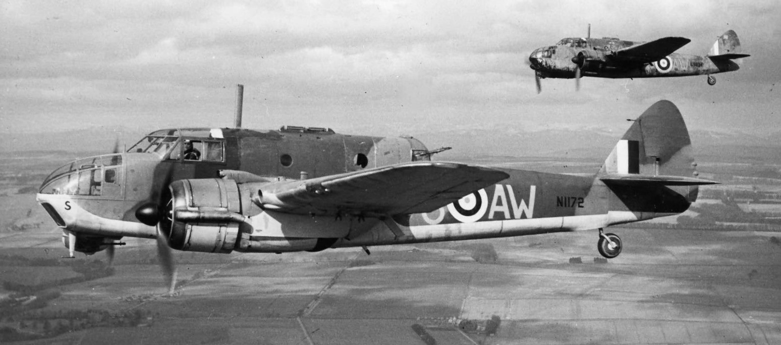 Pair of Bristol Beaufort Mk. Is, including (Serial No. N1172), coded AW-S, No. 42 Squadron, RAF, based at Leuchars, Fife, in flight with (Serial No. L9834), another aircraft of the Squadron. RCAF Sergeant Lloyd Colley Mansell was killed when his Beaufort (Serial No. L 9834) crashed at Craigfootie, Fife in the UK on 30 Aug 1941.