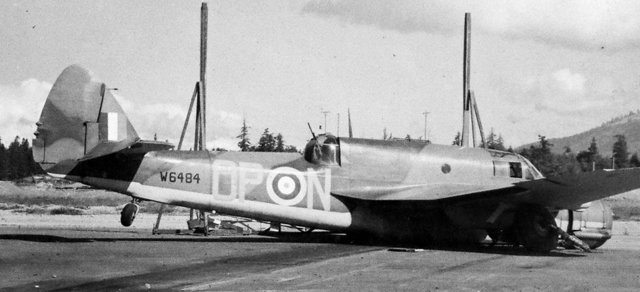 Bristol Beaufort Mk. I (Serial No. W6484), was taken on strength on 7 Aug 1941. With No. 32 Operational Training Unit at RCAF Station Patricia Bay, BC. Coded RD-N and later OP-N. Ground looped while taking off at Patricia Bay on 20 Jun 1942, landing gear collapsed. Starboard propeller and gear box came off when aircraft struck the ground. With No. 149 (TB) Squadron at RCAF Station Patricia Bay, BC in 1942/43. Coded M, date not known. Classified as Instructional Airframe A384 on 9 Mar 1944. (R.W.R. Walker files)