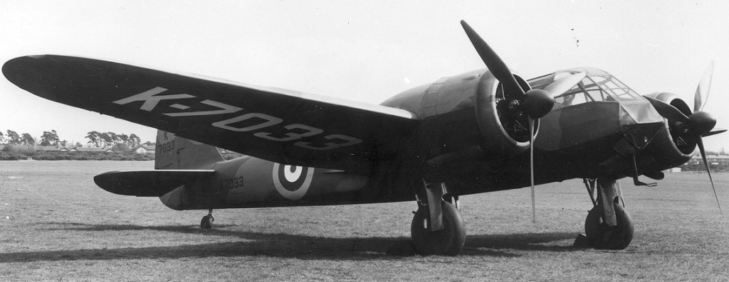 Bristol Type 141M Blenheim Mk. I (Serial No. K7033), prototype, June 1936. The Blenheim was a three-seat twin-engined light bomber, powered by two 840 hp (630 kW) Bristol Mercury VIII radial piston engines, armed with a 0.303 in (7.7 mm) machine gun in the port wing, plus a 0.303 in (7.7 mm) Vickers K gun in the dorsal turret, maximum bombload 1,000 lb (450 kg). 1,552 built.