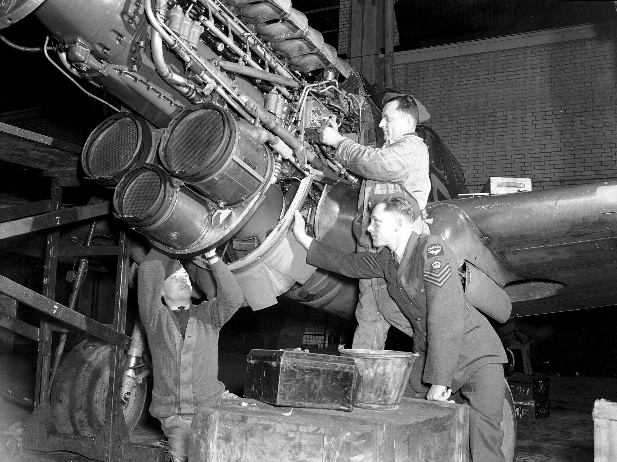 Curtiss P-40 Kittyhawk, No. 400 Squadron, RCAF, with an Electrical repair crew working on its electrical circuits.  Electrically controlled pitch propellors and the fighter’s electrical undercarriage mechanism require close attention.  The three drums under the engine are glycol and air coolers.  On the left is LAC D.E. “Chubby” Grant, of Maxville, Ontario, an ex-hockey player and former Hydro Line-Man.  Centre is 25 year-old C.A. Bowe of Orangeville, Ontario, an ex-salesman, and supervising is F/Sgt. M. Thompson, 25 Bonsley Ave., Toronto, Ontario, ca 1941.