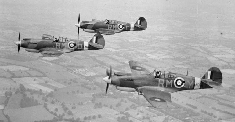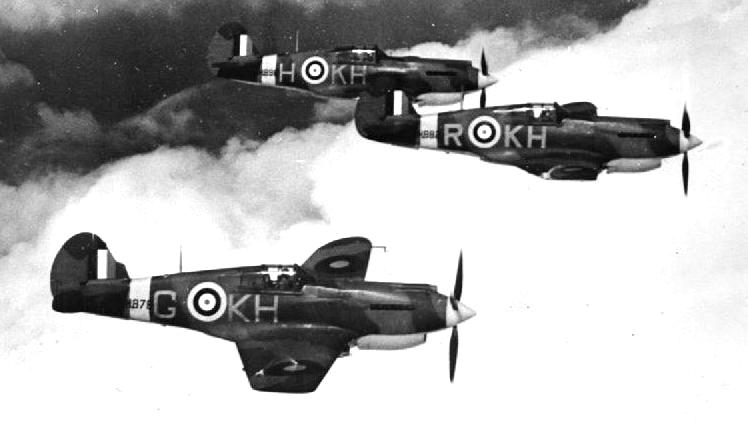 Curtiss Tomahawks of No. 403 Squadron, RCAF, based at Baginton, Warwickshire, in the UK, flying in ‘vic’ formation over clouds.  In the foreground is a Mk. I (Serial No. AH878), coded KH-G, accompanying two Mk. IIAs, (Serial No. AH882), coded KH-R, and (Serial No. AH896), coded KH-H.  These were among the first Tomahawks to enter squadron service with the RAF, although No. 403 Squadron operated them for only a short time in the Army Cooperation role before converting to Supermarine Spitfires in May 1941.