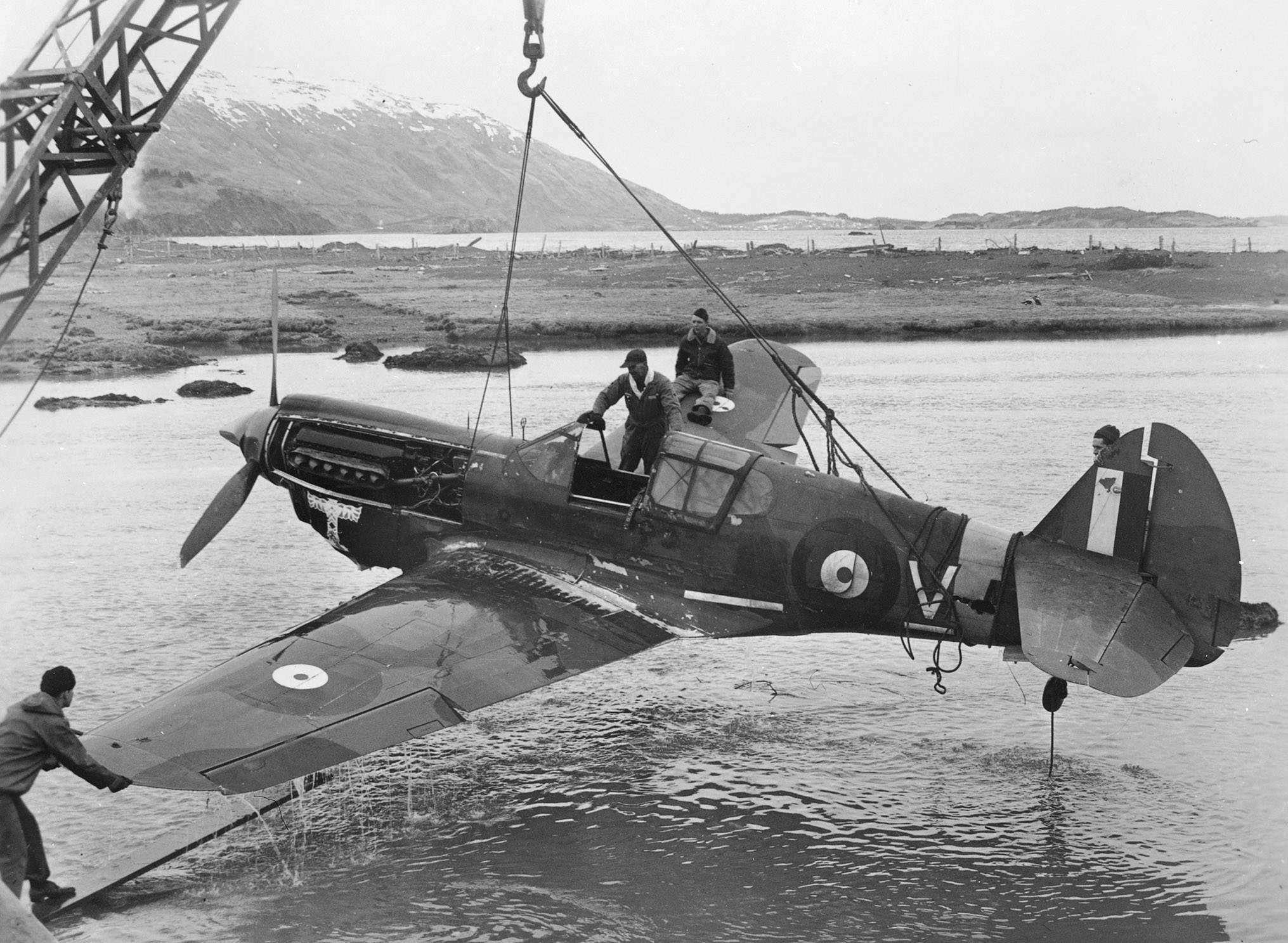 Curtiss P-40E Kittyhawk RAF (Serial No. AL194), RCAF (Serial No. 1087), coded LZ-V, No. 111 (F) Sqn, being recovered from the water at Fort Greely, Kodiak Island, Alaska, 19 Apr 1943.  The pilot was R104777 WO2 S. R. J. McLeod. He was doing a test flight checking the engine, when the electrical system failed. He carried out a flapless landing and ended up dropping over the edge of the runway and into five feet of water.  Co-incidentally, he also had another accident with the same aircraft on the 18th of September, 1942 at Elmendorf Field.  (Chris Charland)