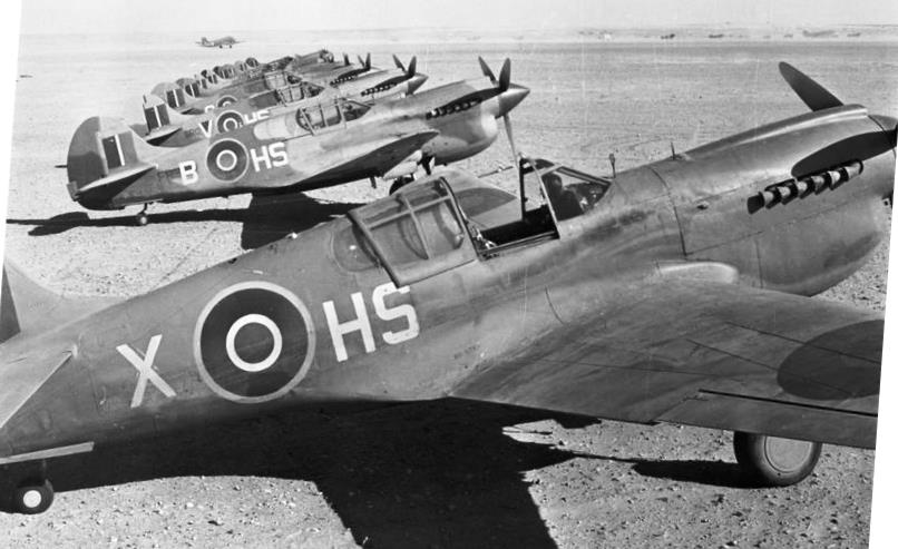 Curtiss Kittyhawk Mk. IIIs of No. 260 Squadron RAF, lined up at Marble Arch landing ground, Libya. In the foreground is the personal aircraft of the squadron commander, Squadron Leader O.V. Pedro Hanbury.  At this time it retained its US (Serial No. 42-45798).  FR350, coded HS-B, was flown by Flight Lieutenant J.F. Edwards RCAF, the most successful Kittyhawk pilot in the Western Desert with twelve confirmed and eight probable victories.
