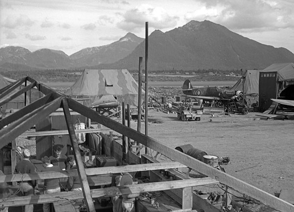 Curtiss P-40E Kittyhawks, No. 111 (F) Sqn, RCAF, Kodiak Island, Alaska, spring 1943.  The aircraft marked “BITSA” (Built In Time To Save Alaska) is reported to have been flown by SL K.A. Boomer when he shot down a Japanese Rufe, 25 Sep 1942. BITSA was” pranged” on final approach at Nak Nek 75 miles West of Lake Illiamna in July 1942 on a re-location flight from Elmendorf to Umnak, Island. For operations, the RCAF utilized the P-40K for the “Kiska Strike” on 25 Sep 1942 and onward until operations ceased in August 1943. (Eva Forbes)