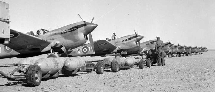 Trolleys loaded with 250-lb GP bombs are drawn up in front of a line of Curtiss Kittyhawk Mk. IIIs of No. 260 Squadron, RAF, at Marble Arch landing ground, Libya, prior to a bombing sortie.  (Serial No. FR350), coded HS-B, (second from the left), was flown by Flight Lieutenant J.F. Edwards, RCAF, the most successful Kittyhawk pilot in the Western Desert with twelve confirmed and eight probable victories.