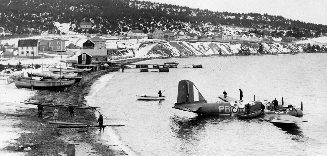 Douglas Digby Mk. I, RCAF (Serial No. 738), coded PB-N, No. 10 “North Atlantic” (BR) Squadron. It ditched in Fresh Water Bay, Newfoundland on 2 Jan 1942, after the starboard engine caught fire. The crew and Newfoundlanders are preparing to drag the Digby to shore. The aircraft was a write-off. (Chris Charland)