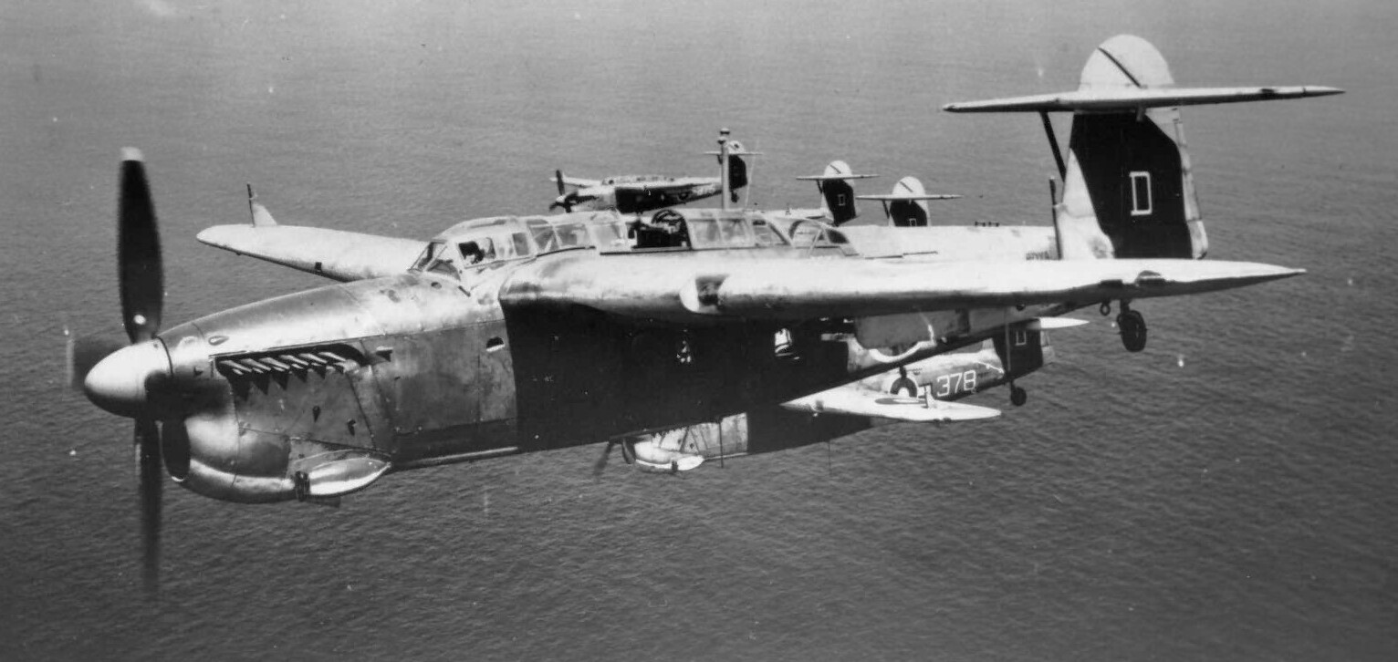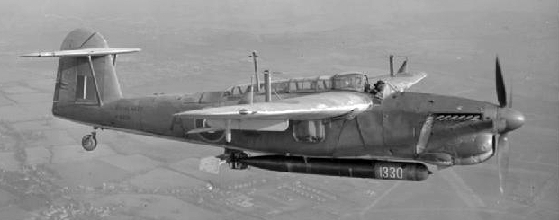 Fairey Barracuda Mk. II carrying an 18-inch (46 cm) aerial torpedo. The ASV radar “Yagi” antennae are visible above the wings. Flown by RCN and RCNVR pilots in service with the Fleet Air Arm, Royal Navy.