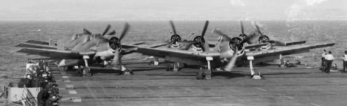 Royal Navy Grumman Hellcats warming up on the flight deck on HMS Ravager.