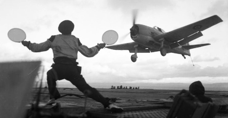 A Grumman Hellcat landing on HMS Ravager as the batsman makes the all-clear signal.