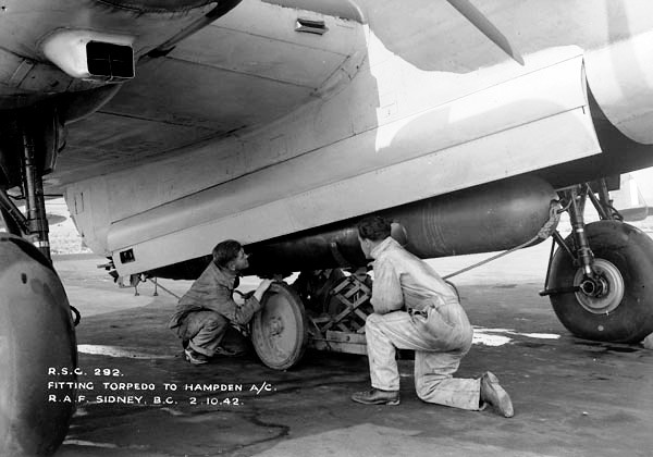 Handley Page Hampden Mk. I with groundcrew loading a torpedo into the bomb bay of an aircraft of No. 32 Operational Training Unit (Royal Canadian Air Force Schools and Training Units), Patricia Bay, British Columbia, 2 October 1942.