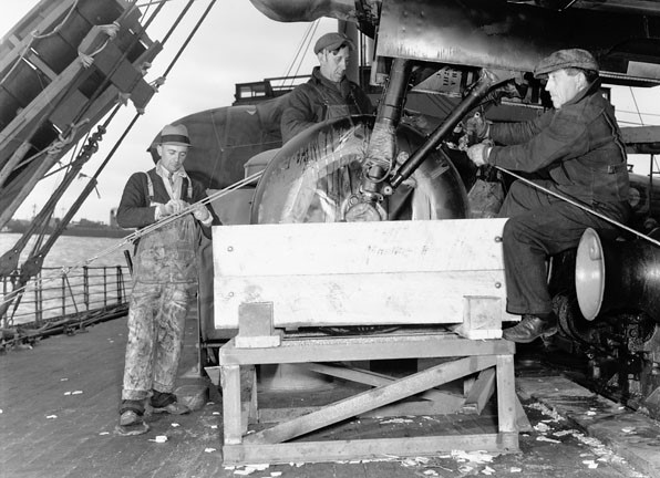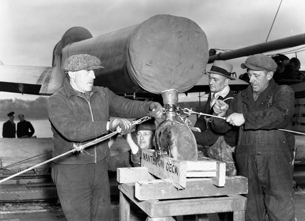 Workers securing a Handley Page Hampden aircraft to the deck of a merchant ship en route to England. Halifax, Nova Scotia, April 1941.