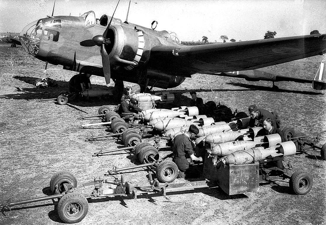 Handley Page Hampdens of No. 408 Squadron RCAF being loaded with mines, 1942.