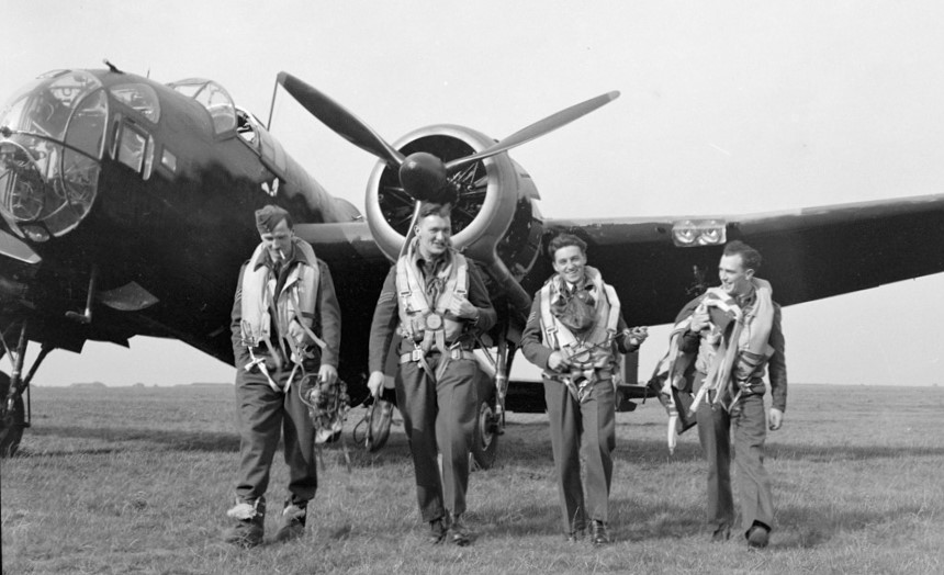 Handley Page Hampden, with four members of a Canadian Bomber Squadron, possibly No. 408, are shown leaving their Hampden after a test trip. Left to Right: Sgt. D.M. Ross, Sgt. K.W. McGrail, Sgt. H.E. Marshall and Sgt. J.K. Fraser, 30 Sep 1941.