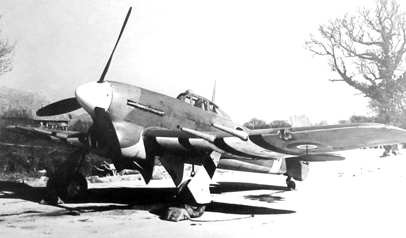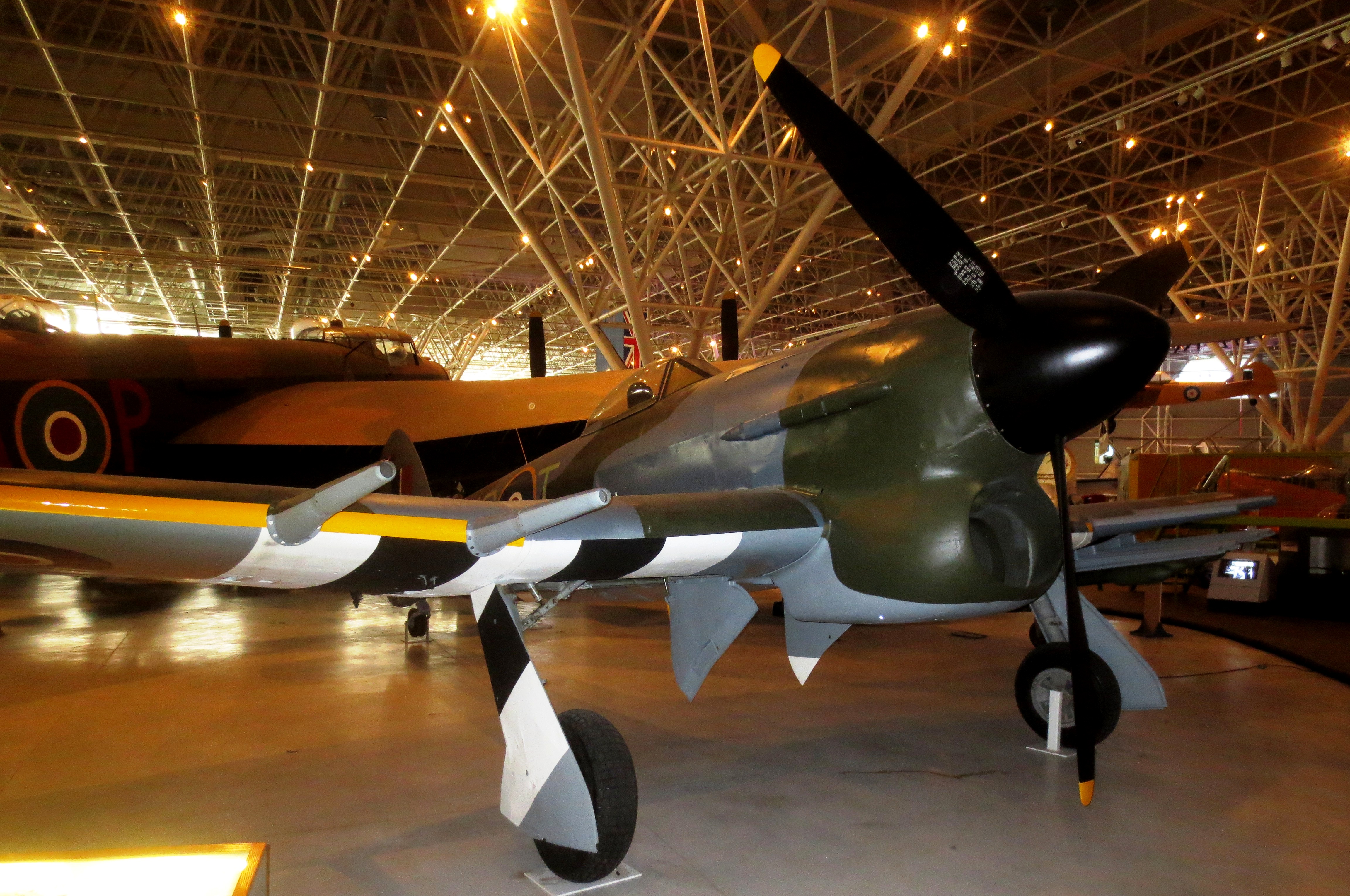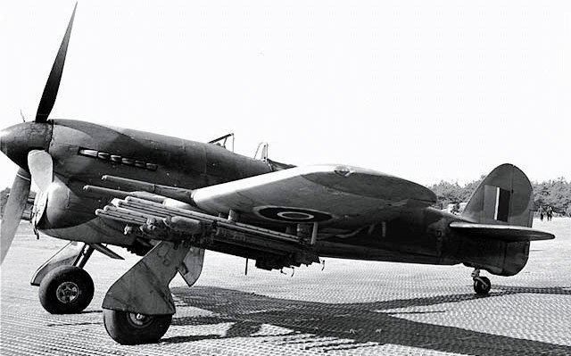 The Typhoon served as a night intruder and long-range fighter. From late 1942 the Typhoon was equipped with bombs and from late 1943 it was armed with RP-3 rockets and four 20-mm Hispano autocannons. The Typhoon became one of the Second World War’s most successful ground-attack aircraft. (Wikipedia)