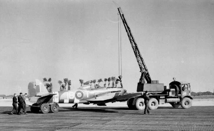 Airmen of No. 419 Repair and Salvage Unit, aided by an AEC mobile crane, remove damaged Hawker Typhoon Mk. IB (Serial No. MN413), coded I8-T, of No. 440 Squadron, RCAF, from the landing strip, following a wheels-up landing at B9/Lantheuil, Normandy, on 1 Aug 1944.