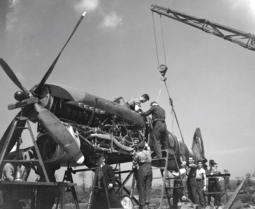 Hawker Typhoon from No. 439 Squadron, RCAF, being worked on by a maintenance crew with a Repair and Service Unit (RSU) having its mainplane and fuselage changed in Normandy, 1944.