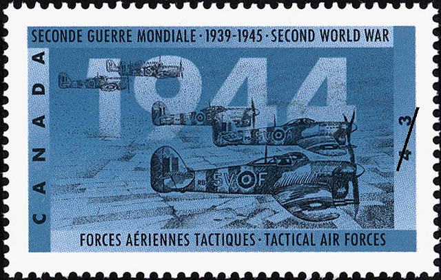 1994 Canadian Stamp illustrating Hawker Typhoon Mk. 1Bs with No. 439 (F) Squadron in formation, commemorating the anniversary of the 1944 D-Day landings and the Tactical Air Forces in the Second World War, 1939-1945.