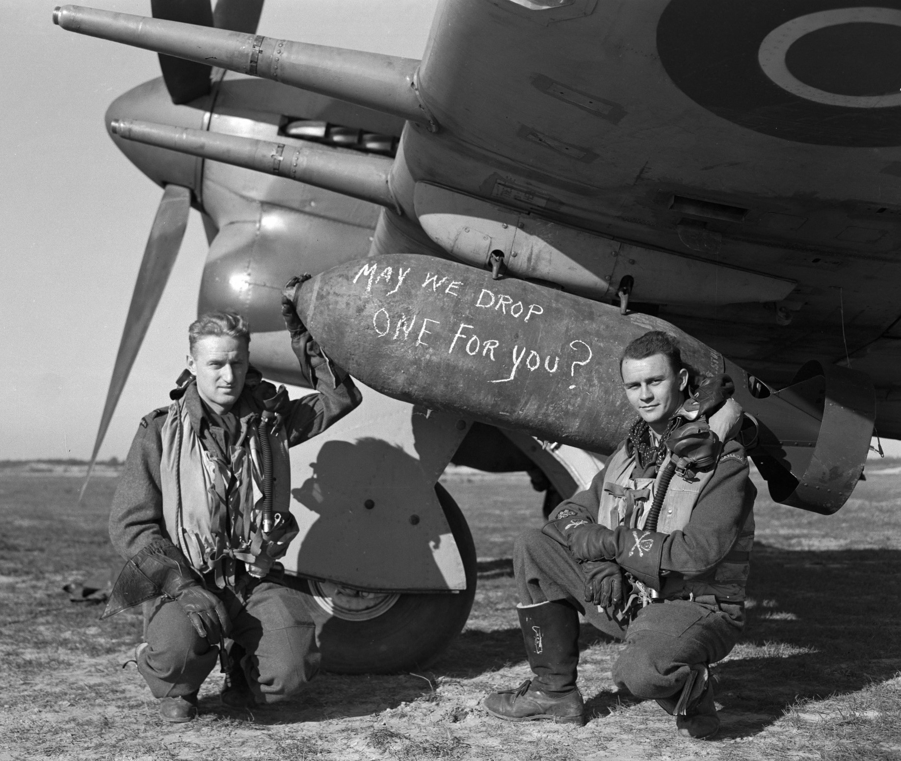 Photo caption states “These are the fellows who deliver the bombs that Victory Bonds buy. Just ready to take off for yet another sortie against a German strong point in Holland, these Canadian Typhoon pilots pause beside of their powerful and expensive Typhoons to direct a short question”.