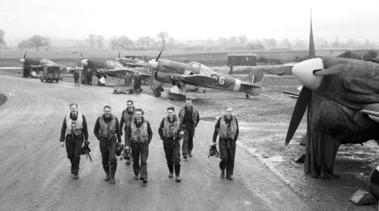Pilots of No. 245 Squadron, RAF, walking past their Hawker Typhoon Mk. IBs, to their dispersal hut at Westhampnett, Sussex, UK, on completion of a sortie against a flying-bomb launching site.in northern France (Noball). Three of the Typhoons wear cowling covers with ‘chimneys’ for the insertion of a heater, in order to aid the engine start. In the background is a Hawker Hurricane, used by the Squadron as a communications and training aircraft.