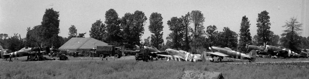 Hawker Typhoon, Vickers-Supermarine Spitfire, Republic P-47 Thunderbolt, and North American Mustang Mk. I aircraft at an Allied mobile repair section, Normandy 25 June 1944.