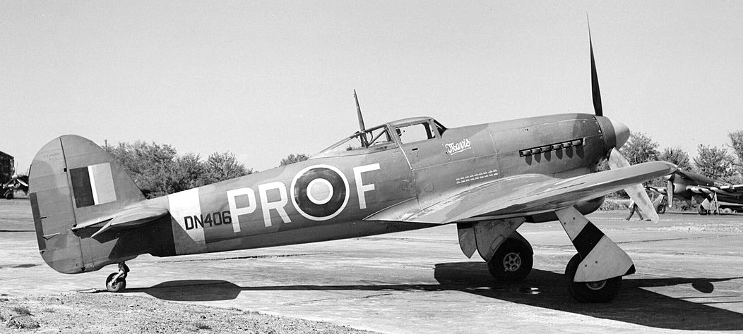 Hawker Typhoon Mk. IB (Serial No. DN604), coded PR-F, “Mavis“, of No. 609 Squadron, RAF, on the ground at Manston, Kent. The aircraft displays a score tally of 18 locomotives destroyed in ground attacks on the fuselage side.
