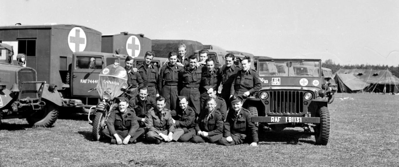 An airman with a Canadian motorcycle along with a group of No. 52 Medical Field Hospital personnel and a 2nd Tactical Air Force Jeep, No. 83 Group, RAF, at the RAF’s B-100 airfield in Germany, ca March 1945.