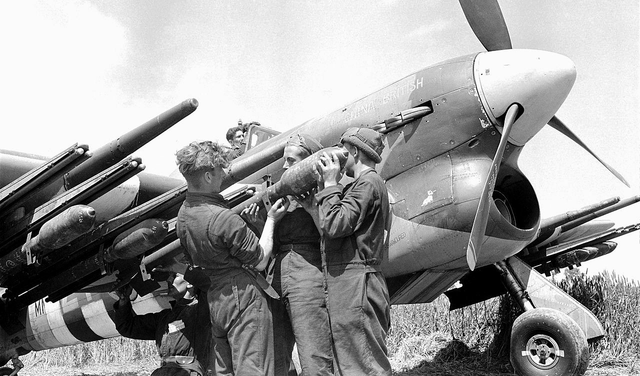 Ground crews loading 3-inch rocket projectiles onto Hawker Typhoon Mk. IB (Serial No. MN317), coded ZY-B, of No. 247 Squadron, RAF at airfield B2/Bazenville, Normandy.
