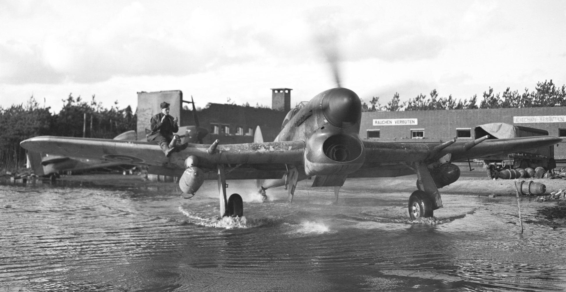 Hawker Typhoon Mark IB of No. 439 Squadron, RCAF, taxies through a water splash at B78/Eindhoven, Holland, while leaving its dispersal loaded with two 1,000-lb bombs for an attack on a rail target behind the German lines.
