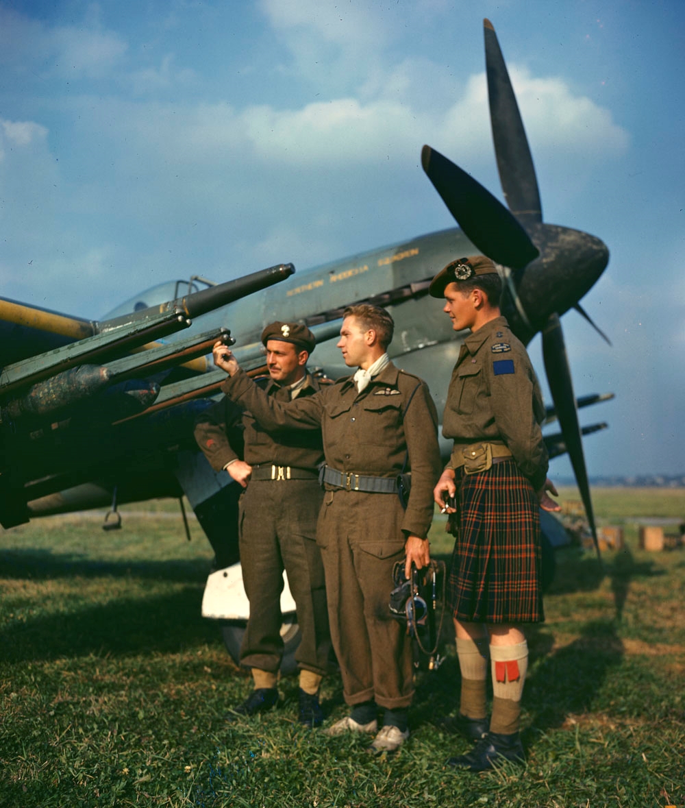 Les Fusiliers Mont-Royal Captain G. Balcer, (Trois-Rivières, Quebec), W.O. 2 Brown (Toronto, Ontario), pilot, and Lieutenant W.C. Pearson (Lumsden Saskatchewan), Cameron Highlanders of Ottawa, examining bombs and rockets mounted on a 2nd Tactical Air Force Hawker Typhoon fighter with No. 266 Squadron in France, 1943. No. 266 Sqn was one of the RAF`s Rhodesian Sqns (hence the titling on the cowling). The pilot was Canadian, as were his visitors. RCAF squadrons that flew the Typhoon included Nos. 400, 438, 439 and 430 Squadrons. The RCAF units apparently only used bombs.