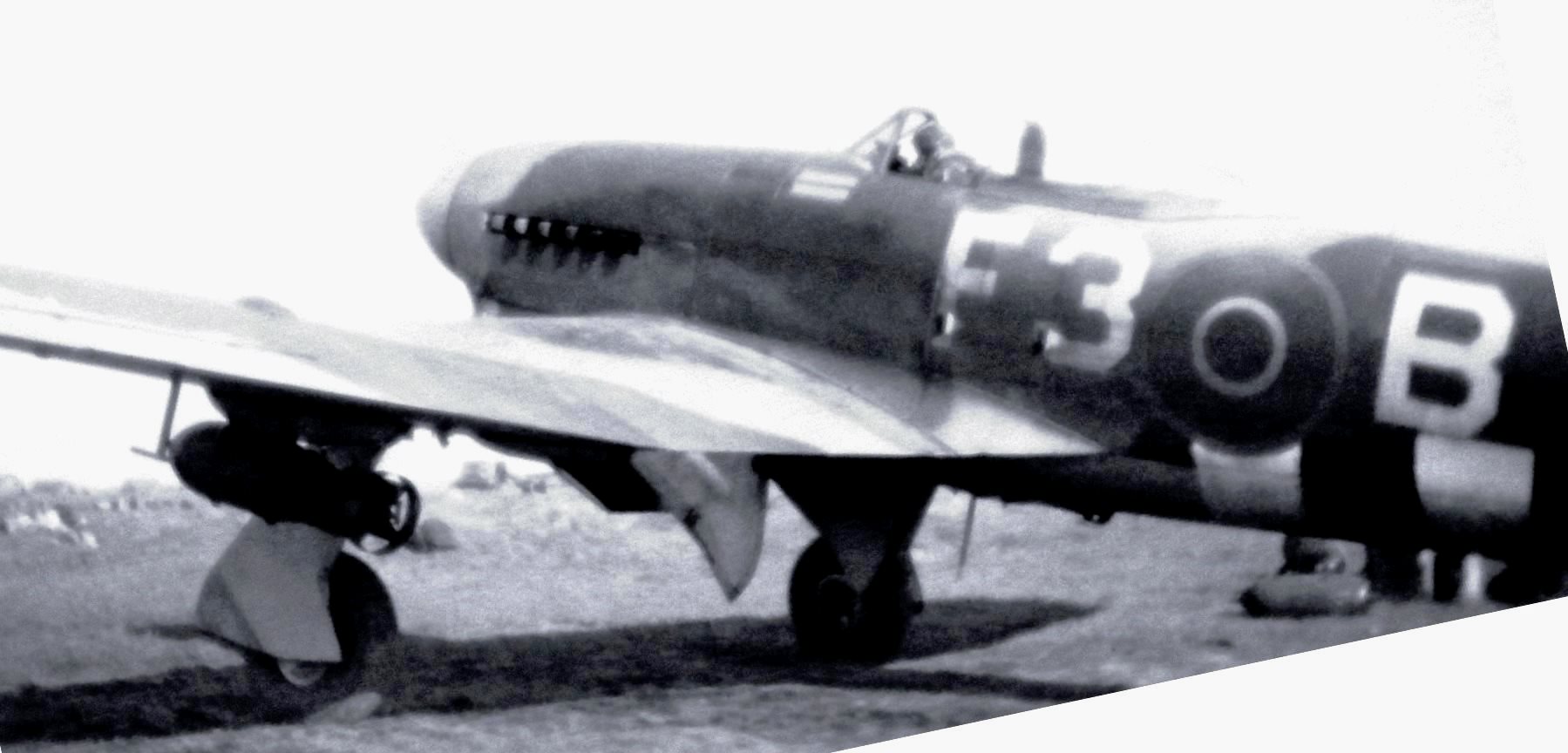 Hawker Typhoon Mk IB, coded F3-P, No. 438 (Fighter Bomber) Squadron. This was André “Andy” Lord’s aircraft, photo taken at B166 Flensburg, Germany in May 1945.