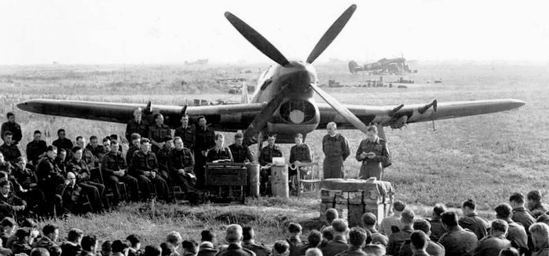The three Canadian Hawker Typhoon squadrons attend mass at airfield B9, Lantheuil, France, on Sunday, 13 August 1944. RCAF No. 143 Wing Padre, Squadron Leader Hebert Ashford, MBE, presiding.