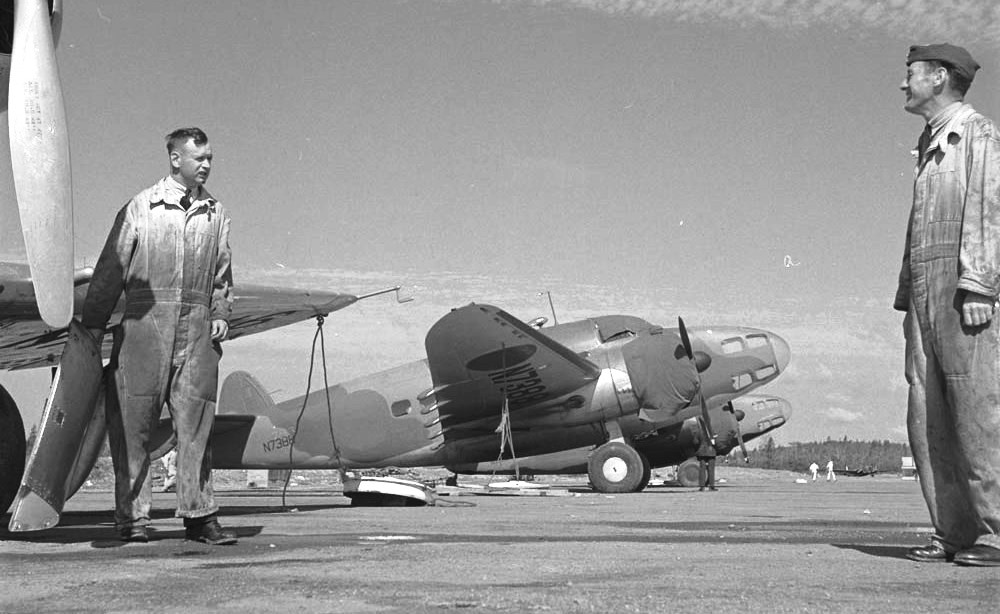 Lockheed L-414 Hudson, RAF (Serial No. 783), ex- N7388, with two members of the RCAF. 783 was diverted from RAF order, tested and delivered marked with RAF serial N7388. To RCAF Station Trenton, Ontario on 15 May 1940. Back to Rockcliffe on 2 July 1940. Operated by No. 11 (BR) Squadron, RCAF Station Dartmouth, NS from 9 August 1940. Stored at Halifax from 11 November 1940 to 4 March 1941. With the Test & Development Establishment at RCAF Station Rockcliffe, Ontario from 17 January 1942, for fitting of special radio equipment. Back to No. 11 Squadron from 29 January 1942. To Central Training Establishment on 21 October 1943, probably for use by an Operational Training Unit. To storage on 22 May 1944. Stored at No. 4 Repair Depot at Scoudouc, New Brunswick, where it was reported with 1079:35 total time. Pending disposal from 28 June 1944.