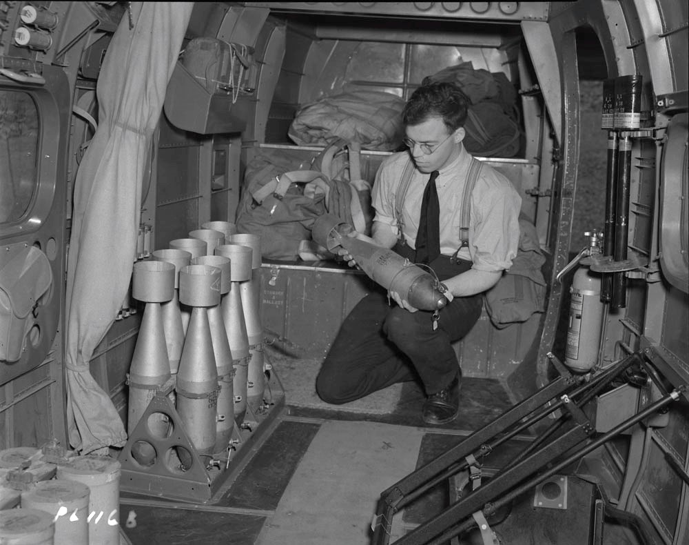 Eastern Air Command, Dartmouth, Nova Scotia. Aircraftman Second Class H.G. Wheeler with smoke bomb on board a Lockheed Hudson, 15 Aug 1940.