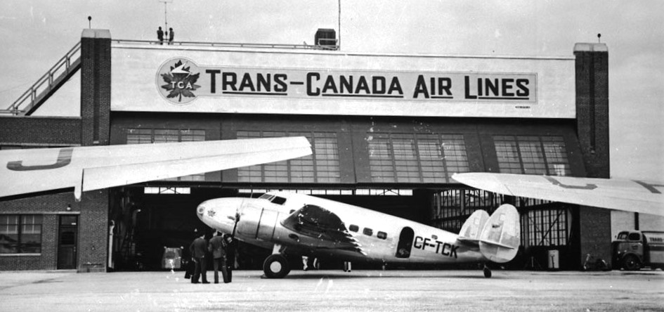 Lockheed Lodestar, Reg No. CF-TCU of Trans-Canada Air Lines outside administration building, Dorval. Quebec, c1940-1945.