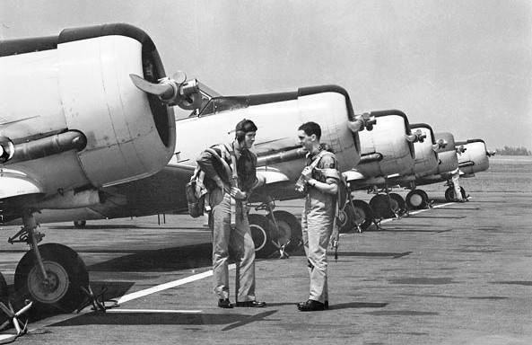 RCAF instructor and student pilot with Harvard MK. IIs on the flight-line, July 1941.