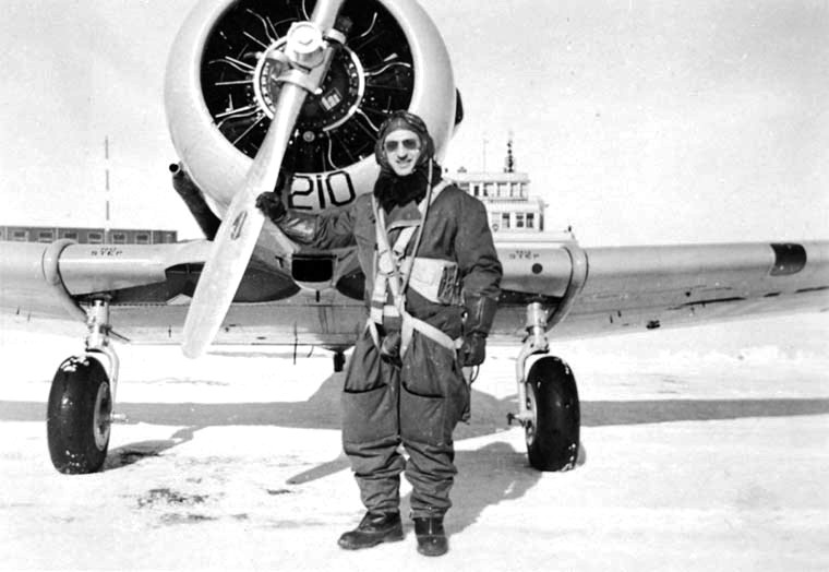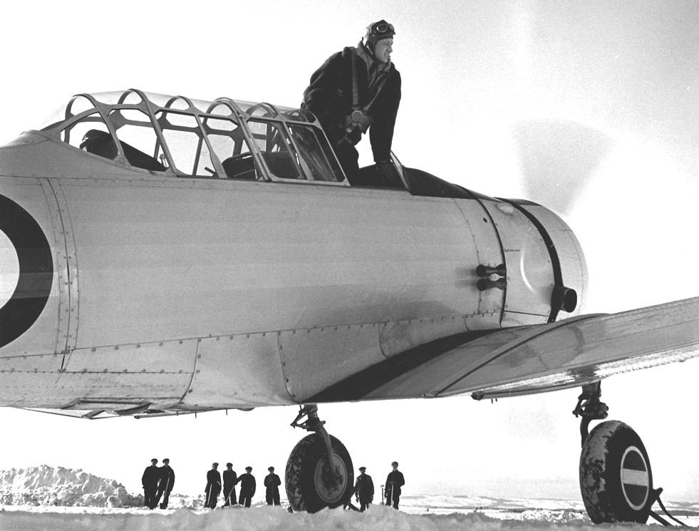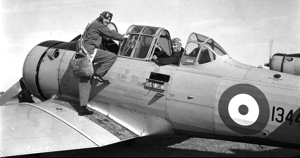 RCAF student pilot taking his place in the cockpit of a North American Harvard Mk. I, 1940. Photo likely taken at RCAF Station Borden or Trenton, Ontario.