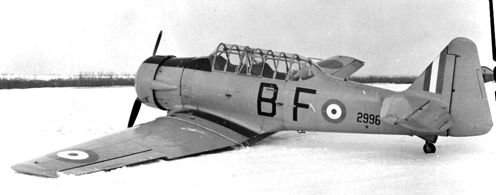 North American NA-66 Harvard Mk. II, RCAF (Serial No. 2996), BF, wing down, 14 Feb 1942.