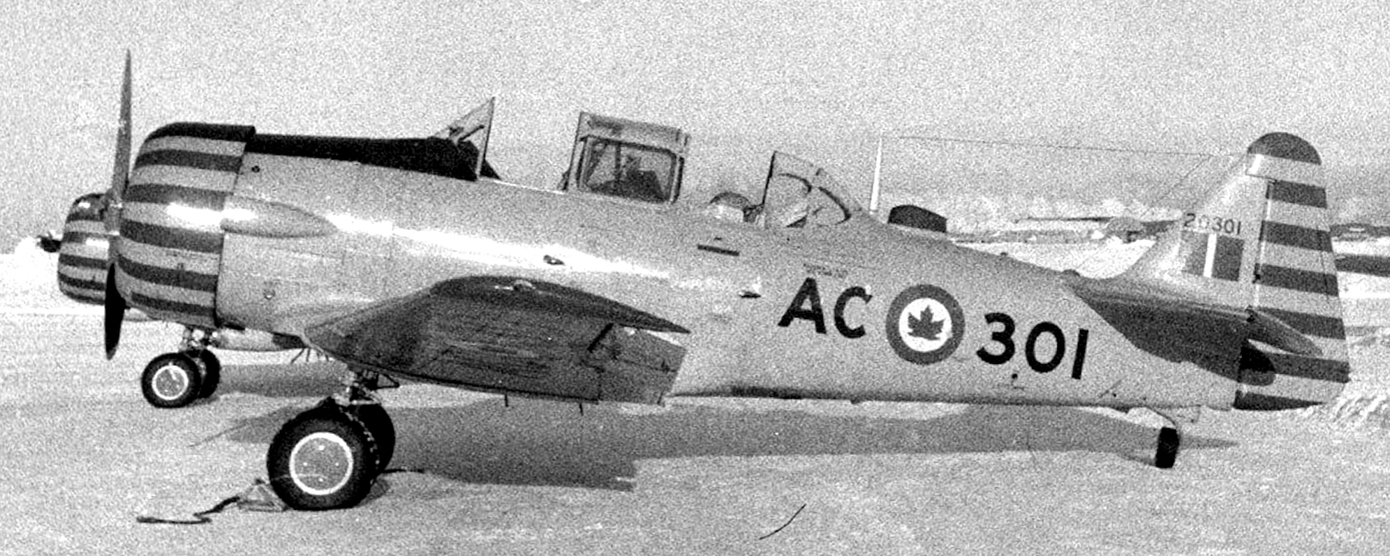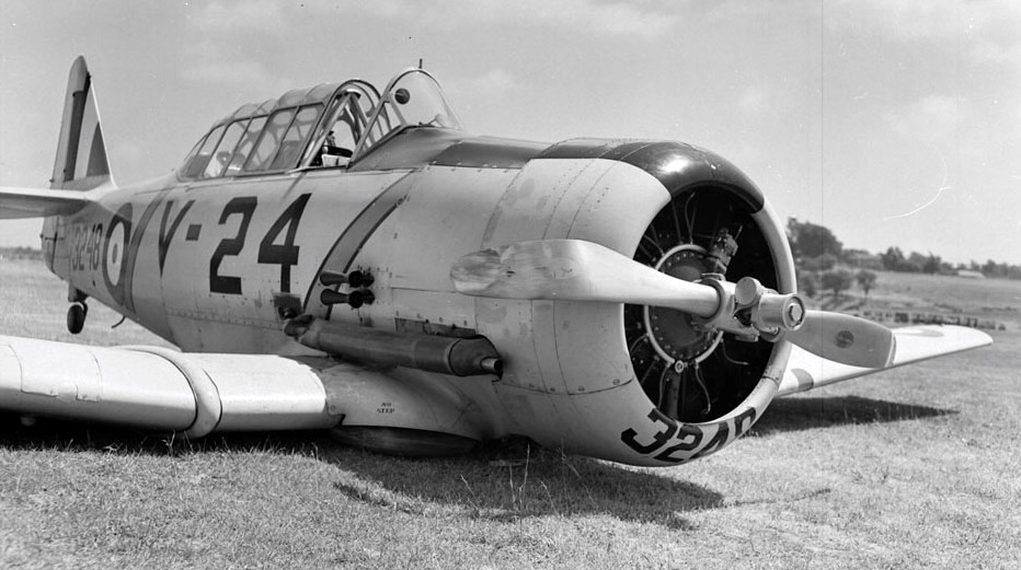 North American Harvard Mk. II (Serial No. 2694), coded 24, from No. 2 Service Flying Training School at RCAF Station Uplands (Ottawa), Ontario. On 27 Apr 1941, LAC F. H. Sproule ground looped it while landing at Uplands. The airframe sustained Cat C2 damage but was subsequently repaired. The aircraft was later transferred to No. 1 Service Flying Training School at RCAF Station Camp Borden, Ontario.