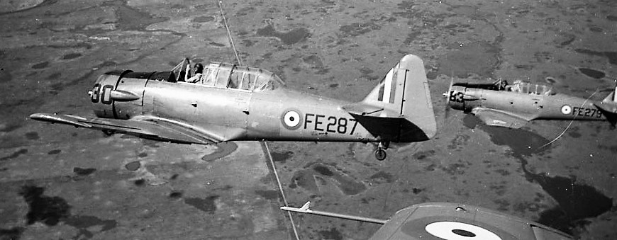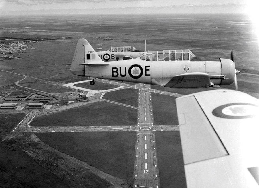 North American Harvard Mk. IIB, RCAF (Serial No. FE287), 30, and (Serial No. FE279), 83, No. 41 Service Flying Training School (SFTS) of the British Commonwealth Air Training Plan (BCATP), Weyburn, Saskatchewan, 1944.