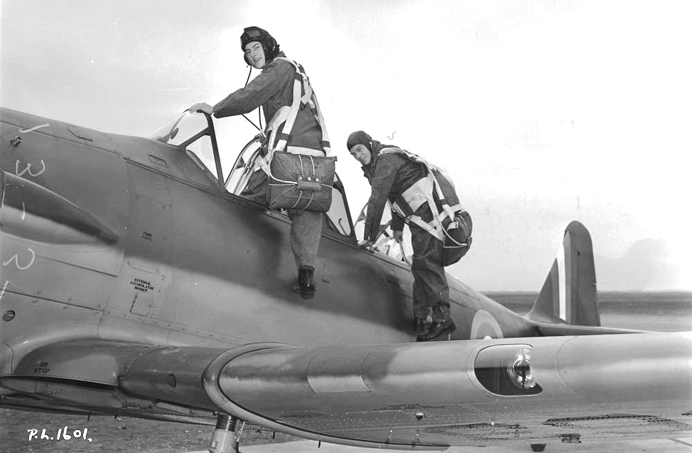 Pilots H.W. Fitch and T.S. Sheppard climb into the cockpit of a North American Harvard Mk. II at No. 4 Service Flying Training School, Saskatoon, Saskatchewan, 4 Oct 1940.