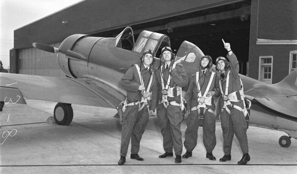 Pilots T.S. Shaples, K. MacBain, R.S. McCloskey and D.F. MacDonald watch the sky while standing in front of a North American Harvard Mk. II at No. 4 Service Flying Training School, Saskatoon, Saskatchewan, 4 Oct 1940.