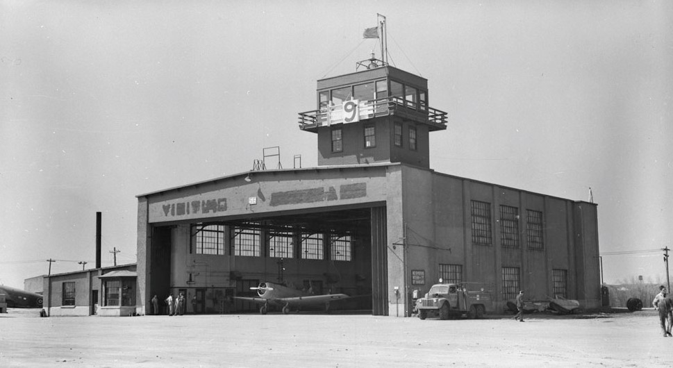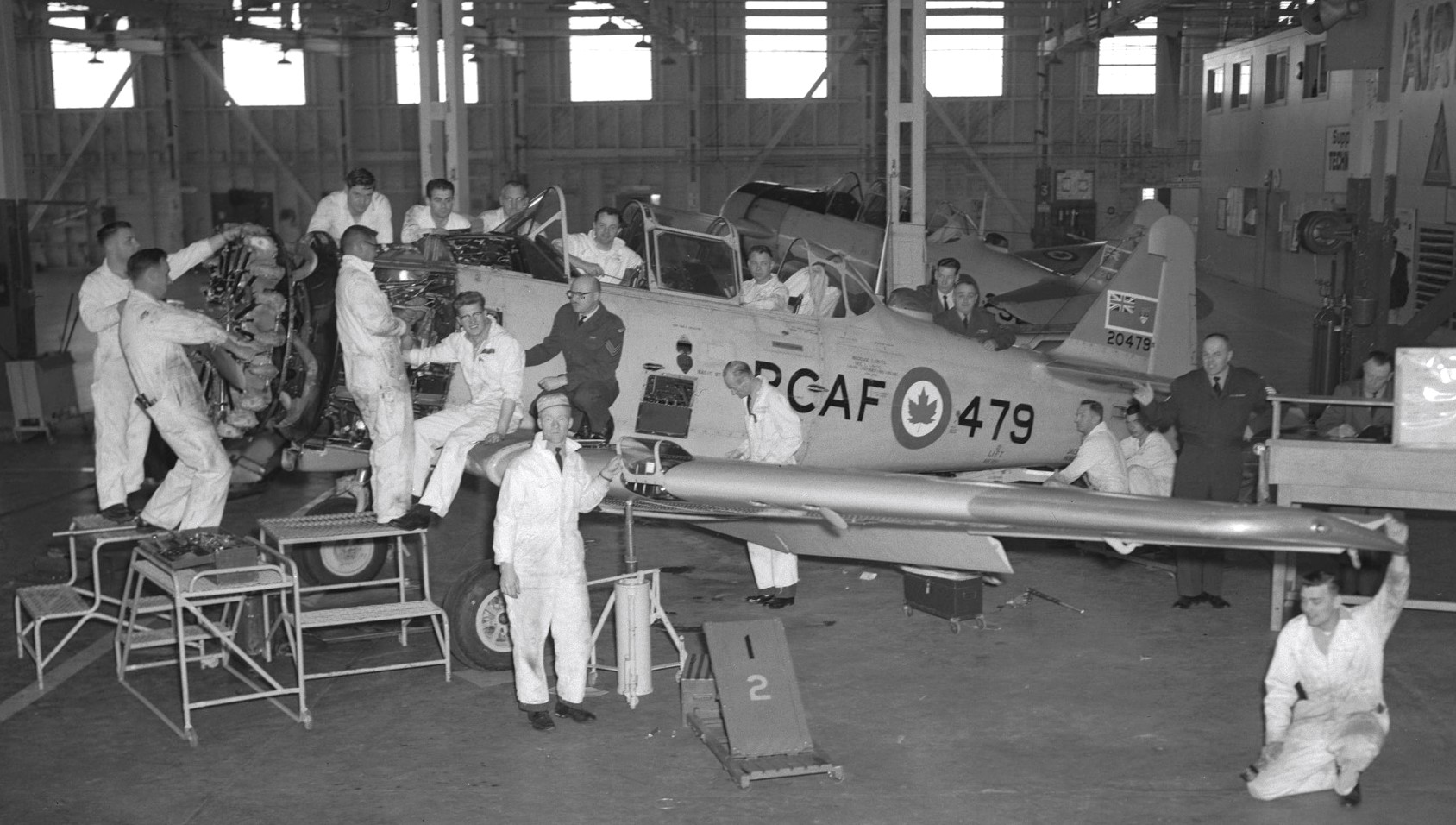 North American Harvard Mk. IIB, RCAF, in hangar, T and D buildings, 1 May 1944.
