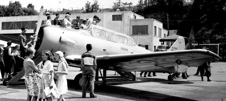 North American Harvard Mk. IV, with a day-glow orange stripe above and below the exhaust, on display at the Canadian National Exhibition, Toronto. Ontario, ca 1955.