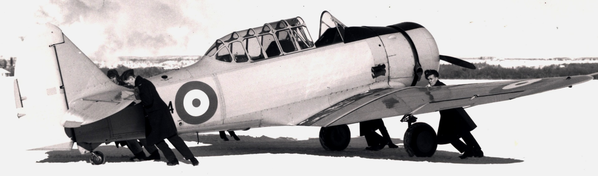 North American NA-75 Harvard Mk. II being pushed into place in the snow.